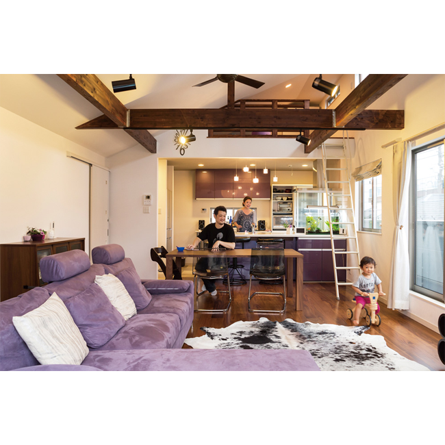 2階リビングで明るく開放的。ウォールナットの床材と色を合わせた化粧梁はダークブラウンでまとまり、大好きな紫色と調和されたハイセンスなお住まい。