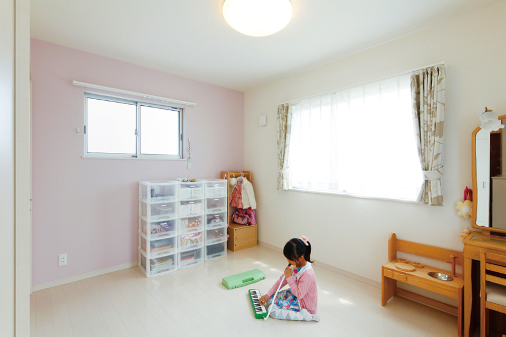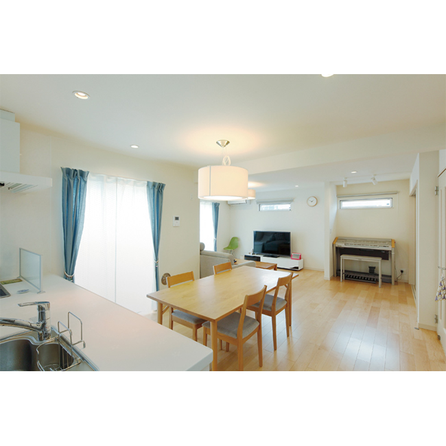 物がきちんと片付くよう家中あちこちに収納を設けた。キッチンカウンター全面も収納になっており収納充実。