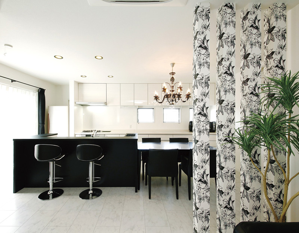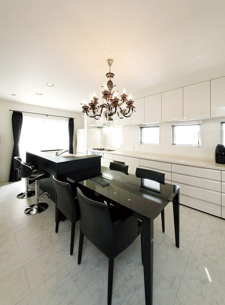 シャンデリアとの相性が良いリビングの花柄クロスは、こだわりの輸入品。大理石調のフロアが高級感をプラス。